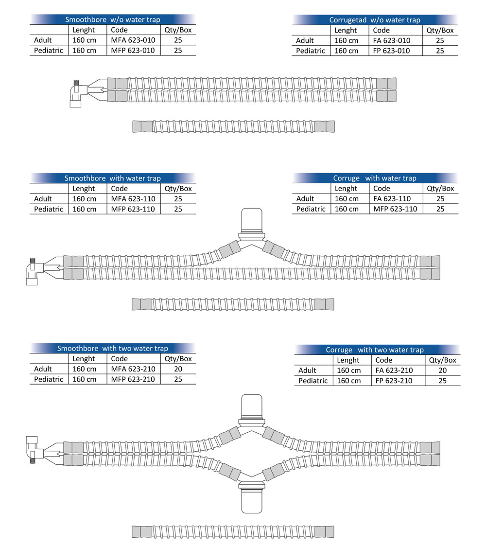 The circuits are manufactured in different standard lengths; components such as the balloon, connector, and limb can be included in the set depending on the anesthesia machine model used.